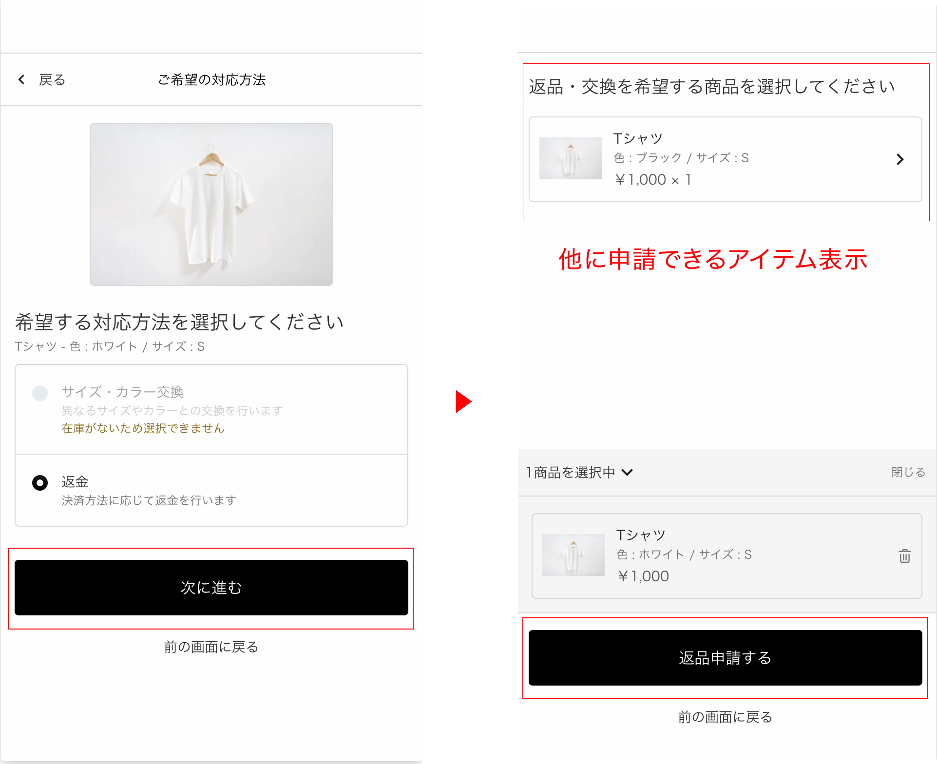 1商品返品申請の後、「次に進む」をクリックすると、他の商品の返品申請が可能です。
