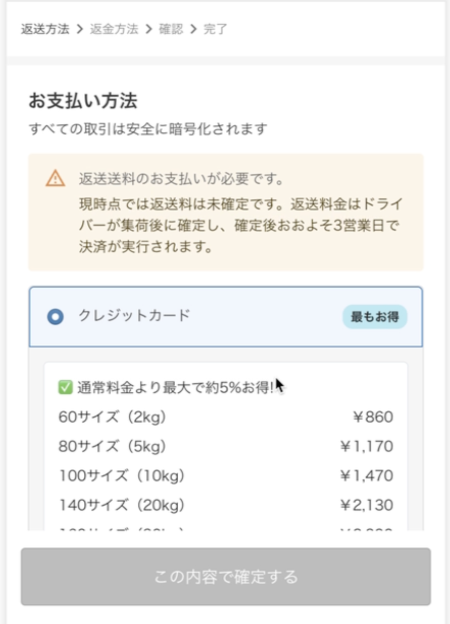 送料はお客様ご負担となりますが、佐川急便へ集荷依頼をしていただく際に、クレジットカードで送料をお支払いいただくことが可能です。